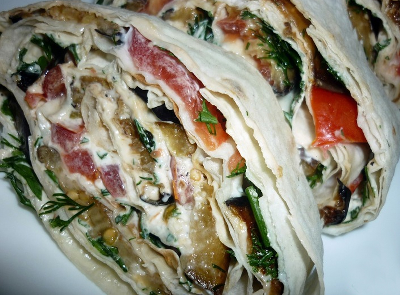 Wariant 1. Obierz bakłażana ze skórki, pokrój w cienkie plastry, a następnie podsmaż na rozgrzanej patelni z olejem. Gotowego bakłażana, poukładaj na tortilli i wysmaruj majonezem lub śmietaną. Potem, poukładaj plasterki pomidora i ciasno zawiń w rulon. Rulony pokrój na mniejsze kawałki.