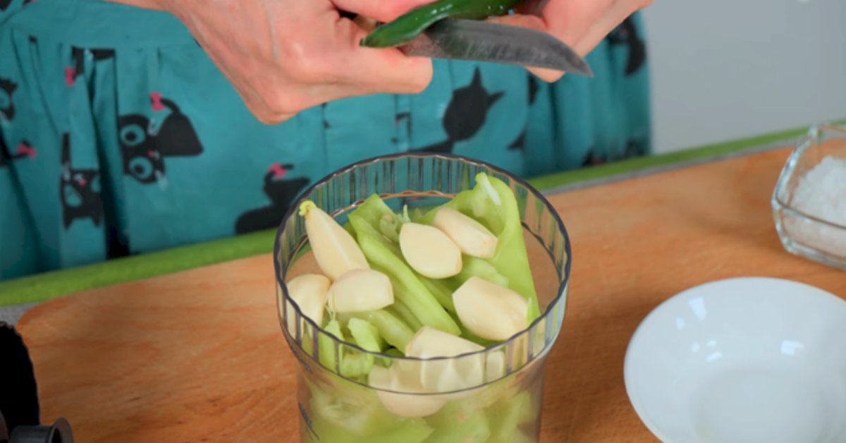 1. Do blendera włóż pokrojoną na mniejsze kawałki umytą oraz osuszoną paprykę. Następnie dodaj także obrany czosnek oraz kawałek papryczki chili. Z przygotowanych składników przygotuj pastę.