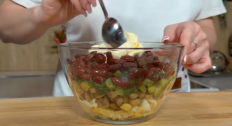 Dodaj posiekany koperek i 400 g czerwonej fasoli konserwowej. Przeciśnij 1 ząbek czosnku przez praskę i dodaj do sałatki. Dopraw solą i pieprzem do smaku. Dodaj 2 łyżki majonezu i dobrze wymieszaj.