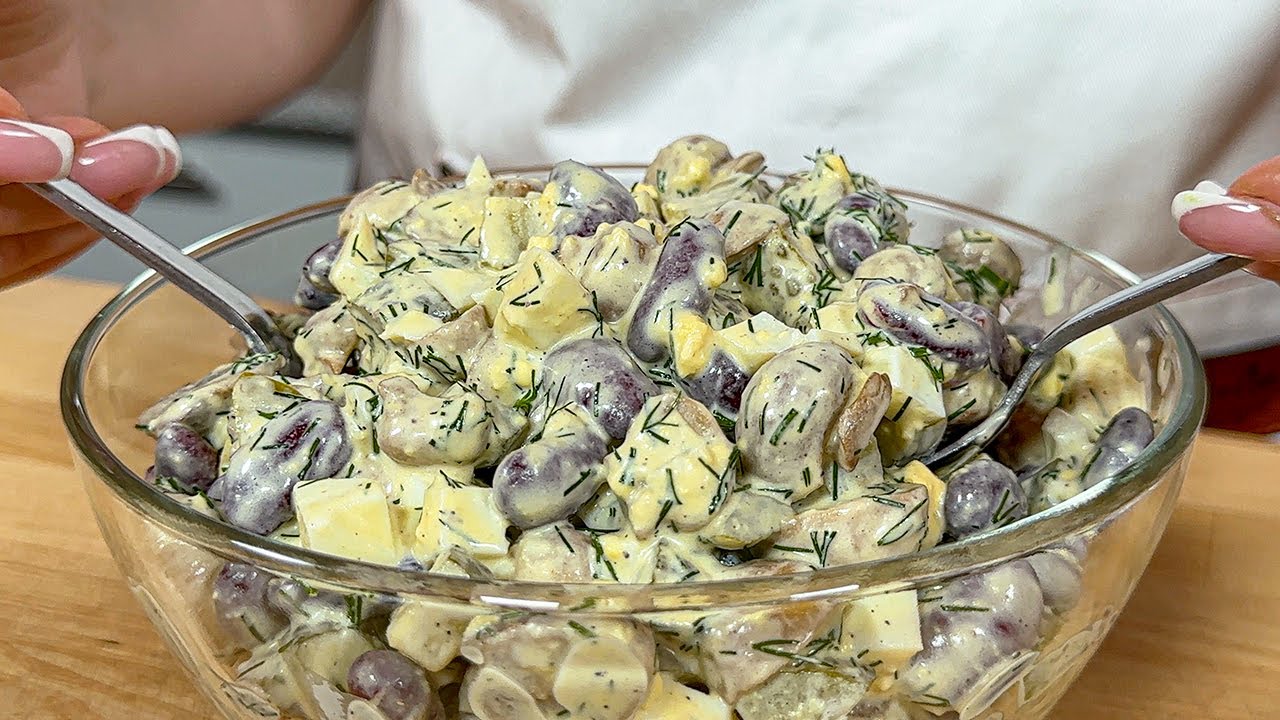 Dodaj posiekany koperek i 400 g czerwonej fasoli konserwowej. Przeciśnij 1 ząbek czosnku przez praskę i dodaj do sałatki. Dopraw solą i pieprzem do smaku. Dodaj 2 łyżki majonezu i dobrze wymieszaj.