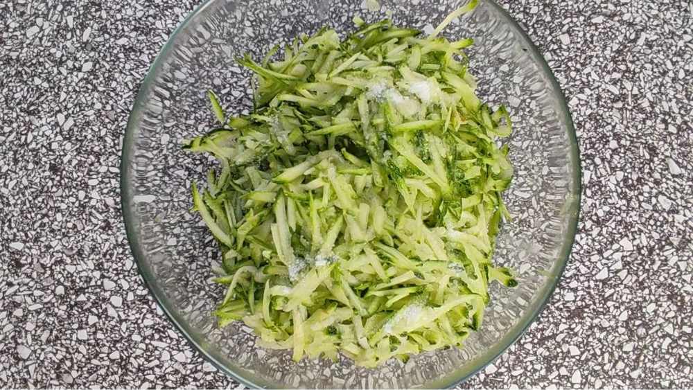 1.Używając tarki, zetrzyj na niej dokładnie umytą cukinię. Posyp ją odrobiną soli , dokładnie wymieszaj i pozostaw na kilka minut . Po upływie tego czasu przełóż na sito cukinię i wyciśnij z niej sok.