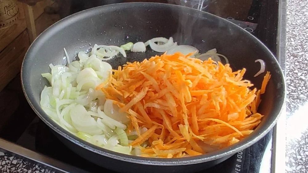 2. Na patelni z dodatkiem oleju smaż pokrojoną w pół piórka cebulę oraz startą na dużych oczkach marchewkę.