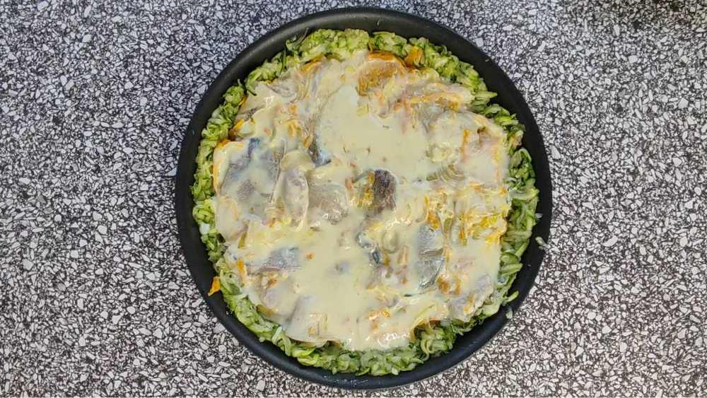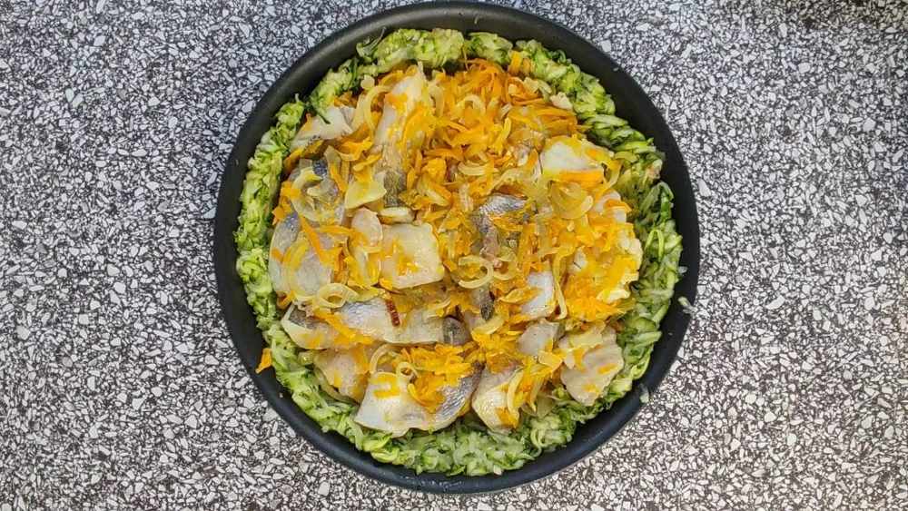 5.Na dno wysmarowanej olejem blachy połóż przygotowaną startą cukinię. Jako kolejną warstwę połóż przygotowany farsz z ryby.