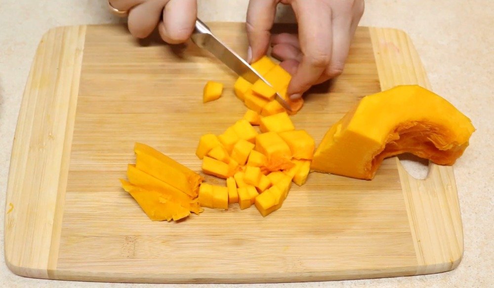 1.Na mniejszą kosteczkę pokrój oraną oraz dokładnie oczyszczona dynie.