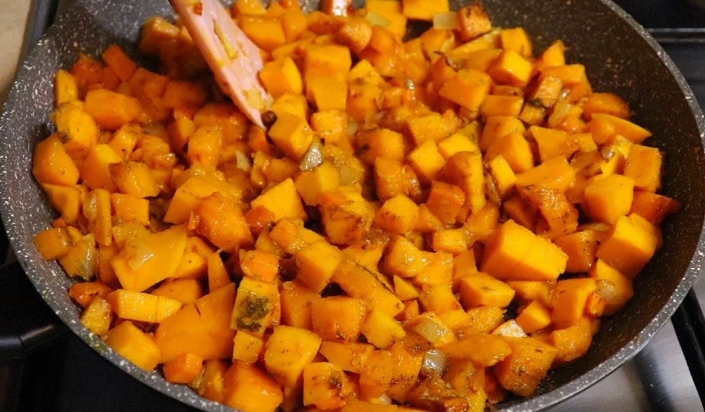 2.Na patelni podsmaż pokrojona cebulą oraz marchew, co jakiś czas mieszają, następnie dodaj do niej pokrojoną dynię.