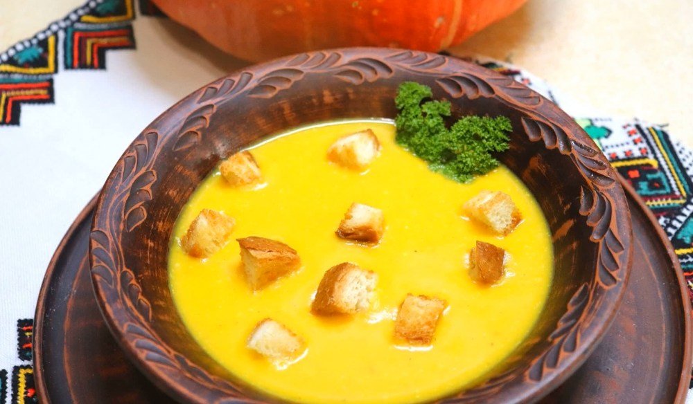 Gotowa zupa krem idealnie smakuje z grzankami czosnkowymi oraz drobno pokrojonymi ziołami Życzę smacznego!