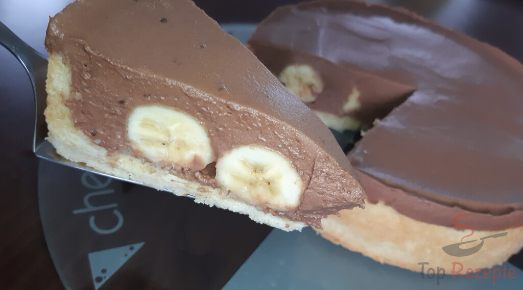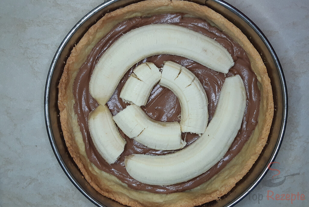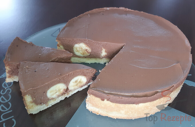Upieczone ciasto posmaruj dokładnie śmietanką, następnie połóż pokrojone banany po czym przykryj całość przygotowanym kremem czekoladowym. Wstaw do lodówki na kilka godzin lub na całą noc.