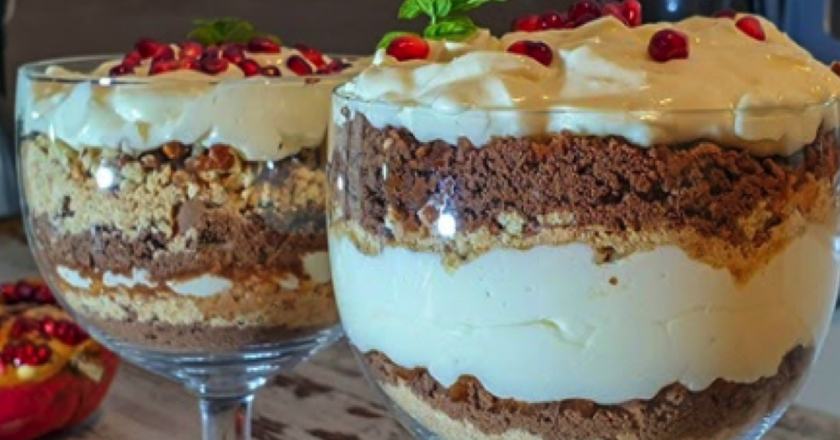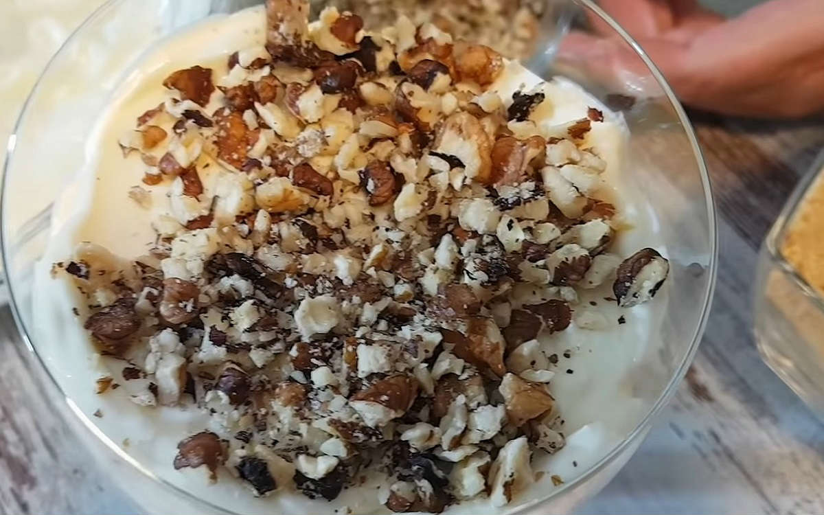 3. W naczyniu żaroodpornym , na blaszce lub w pucharku możesz układać warstwy. Zależy w jakim naczyniu chcesz zrobić. Warstwa na samym dole najlepiej jak by była z orzechów i biszkoptów, następnie przełożyć masą i później po raz kolejny orzechy i biszkopty.