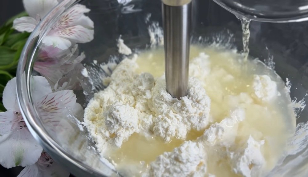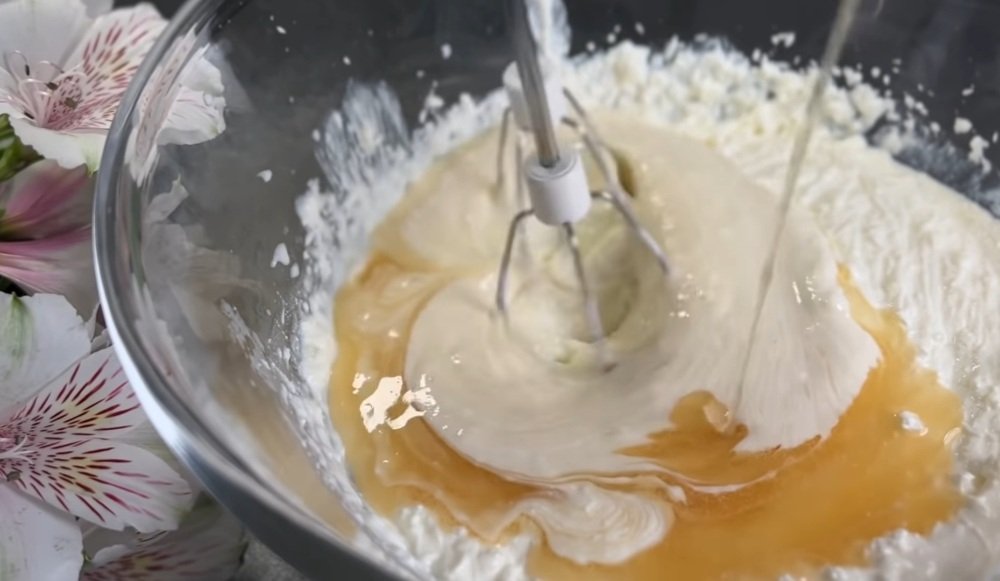 3. W dużej misce dokładnie rozgnieć twaróg. Następnie dodaj do niego gotowy sok z puszki i dokładnie wymieszaj.