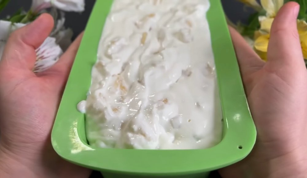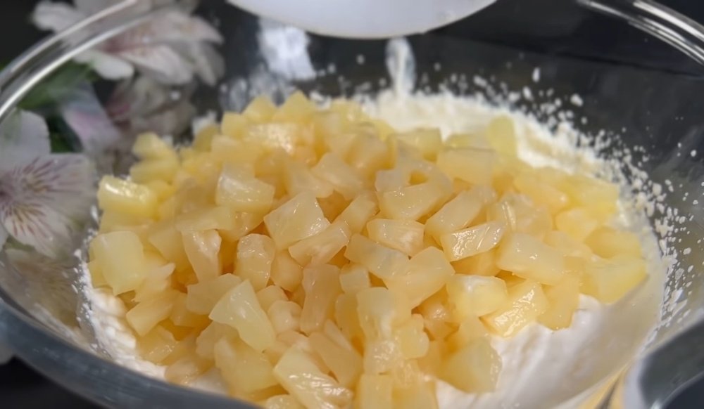 5.Do wymieszanej masy dodaj kawałki ananasa lub pokrojone brzoskwinie.