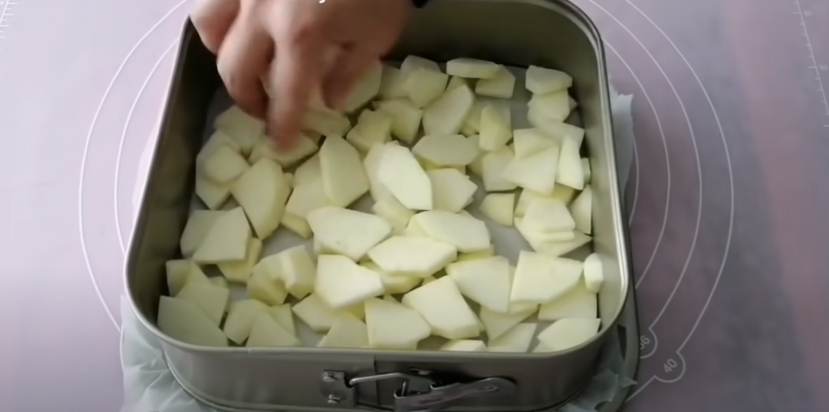4. Obierz jabłka, które pokrój na małą kosteczkę. Blachę posmaruj masłem , następnie połóż na niej gotowe jabłka, a na nie wlewaj przygotowane ciasto.