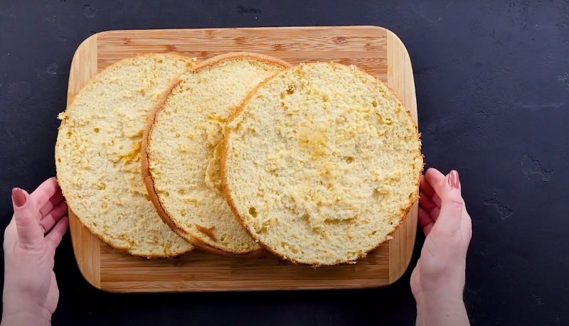 2. Przygotowane ciasto przelej na blachę, którą wcześniej pokryj papierem do pieczenia. Piecz przez 35 minut w 180 stopniach. Po tym czasie pozostaw biszkopt w piekarniku, aż całkowicie wystygnie. Następnie pokój go na trzy części.