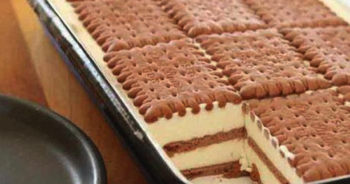 Blaszkę o wymiarach 20 x 30 cm wyłóż papierem do pieczenia i wyłóż na nią pierwszą warstwę herbatników, namoczonych wcześniej w mleku. Na warstwę ciastek nałóż przygotowany wcześniej krem.