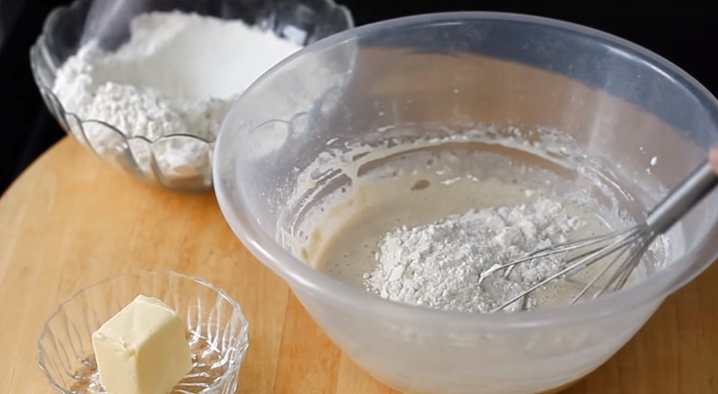 1.Wymieszaj w dużej misce drożdże z ciepłym mlekiem, następnie dodaj łyżkę cukru oraz 2 łyżki mąki. Odstaw na bok, aby mogło urosnąć.