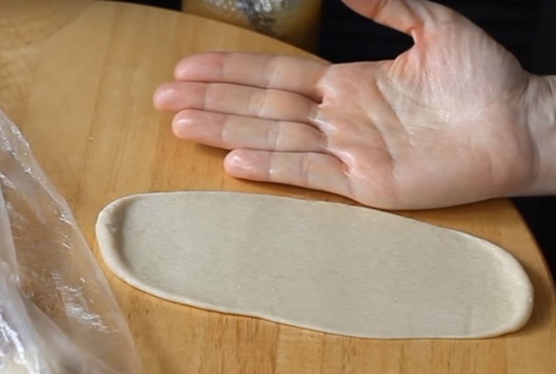 5.Z pociętych kawałków uformuj kulki, później na wydłużone , cienkie placki dokładnie rozwałkuj, placek powinien być dłuższy niż dłoń.