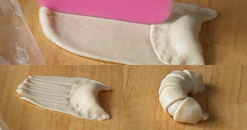 7.Na brzegu przeciwnym, zrób cztery cięcia, nacięte paski pozwijaj wokół przygotowanego wypełnienia.