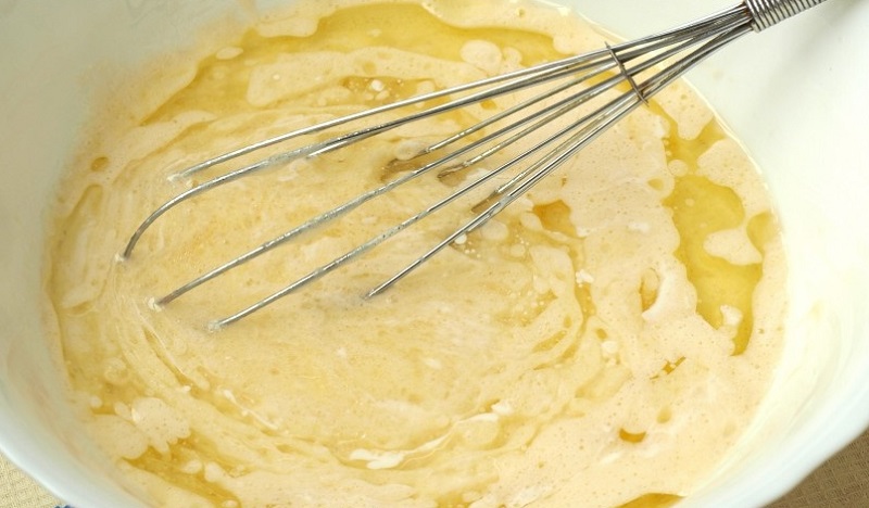 1. W małym garnku, roztop masło z cukrem. Kiedy wystygnie, dodaj jajka i kwaśną śmietanę. Ubij mikserem na jednolitą masę.