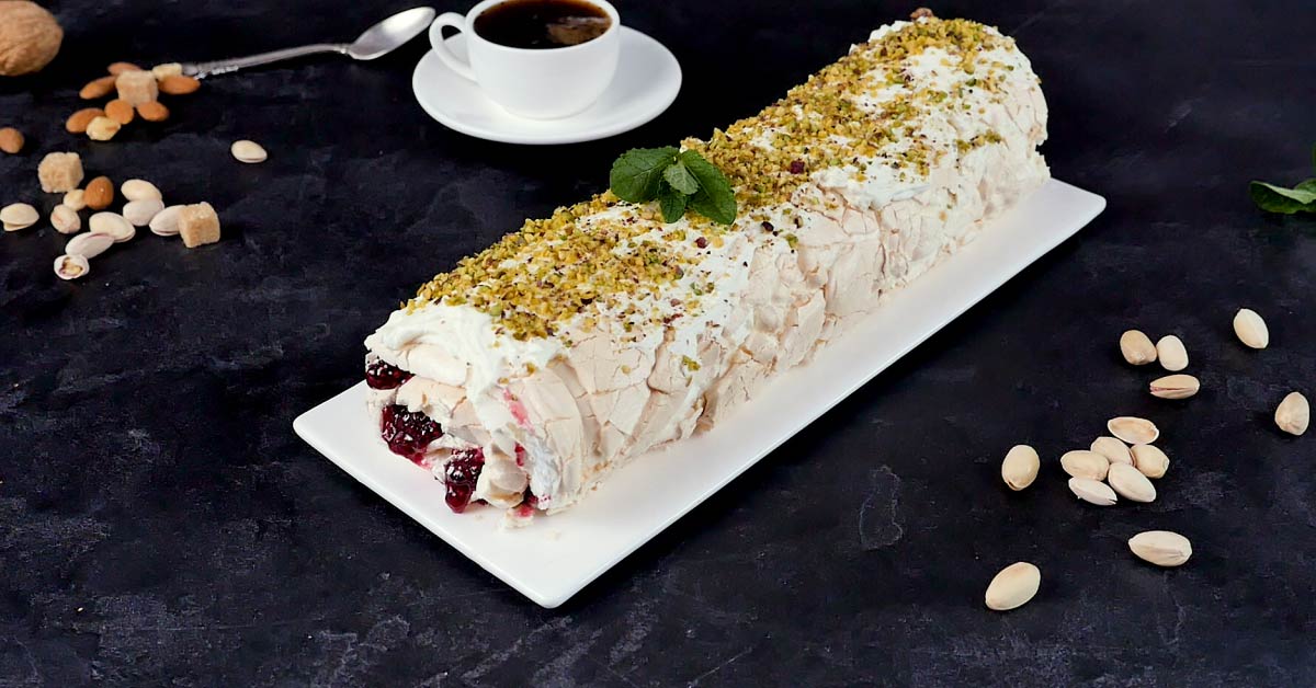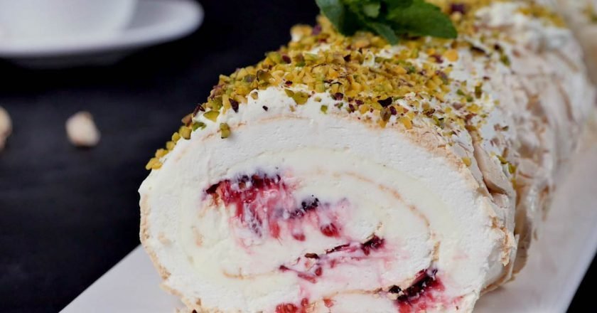 4. Na upieczoną bezę, wyłóż równomiernie krem (zostawiając trochę do dekoracji). Potem, w kilku miejscach wyłóż paski dżemu i delikatnie zwiń całość w ciasny rulon. Wierzch wysmaruj pozostałym kremem i posyp zmielonymi pistacjami. Gotowe!