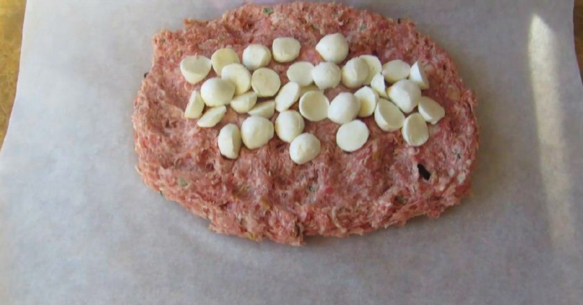 2. Teraz przełóż mięso na papier do pieczenia i ułóż na kształt prostokąta. Następnie poukładaj na nim plasterki mozzarelli.