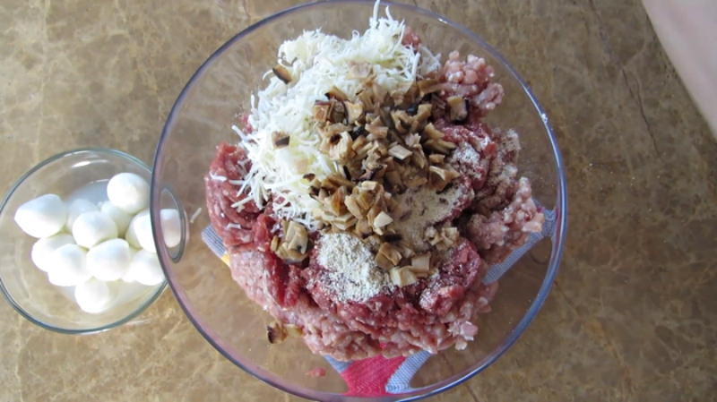 1. W dużej misce, wymieszaj dwa rodzaje mięsa i dodaj sól, czarny pieprz, drobno pokrojone pieczarki oraz starty na tarce o grubych oczkach twardy ser i posiekaną natkę pietruszki. Dokładnie wymieszaj.