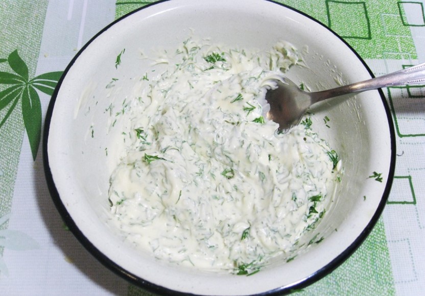 1. Do miseczki przeciśnij przez praskę czosnek, dodaj posiekane zioła i majonez. Dokładnie wszystko wymieszaj.