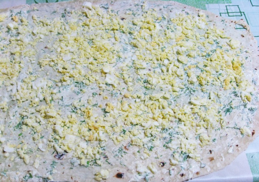 6. Teraz przykryj drugim plackiem tortilli, posmaruj go drugą porcją sosu i na całej jego powierzchni umieść starte jajka. Przykryj trzecim plackiem tortilli, posmaruj go sosem i posyp startym żółtym serem.