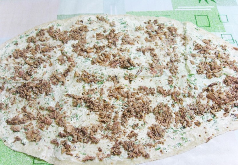 5. Następnie, rozłóż na całej jego powierzchni rozdrobnioną rybę.
