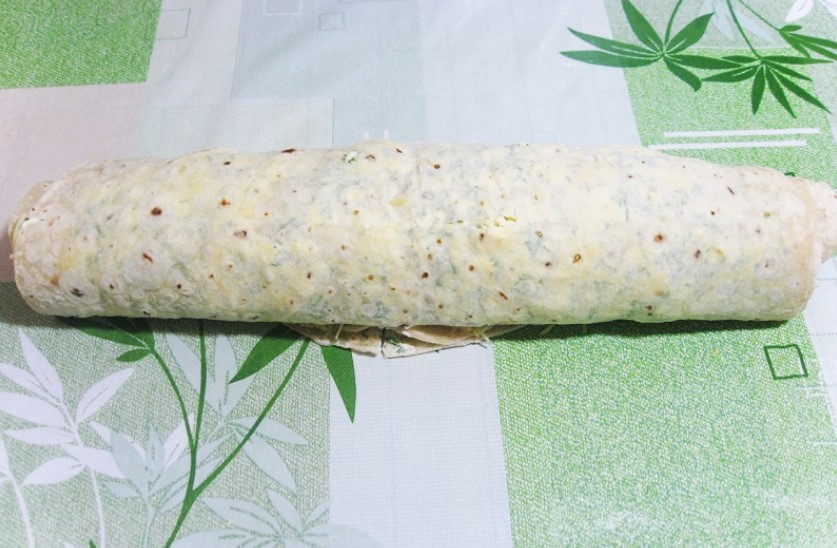 7. Tak przygotowane warstwy, zawiń ciasno w rulon, owiń folią spożywczą i wstaw do lodówki na 3-4 godziny. Gotowe!