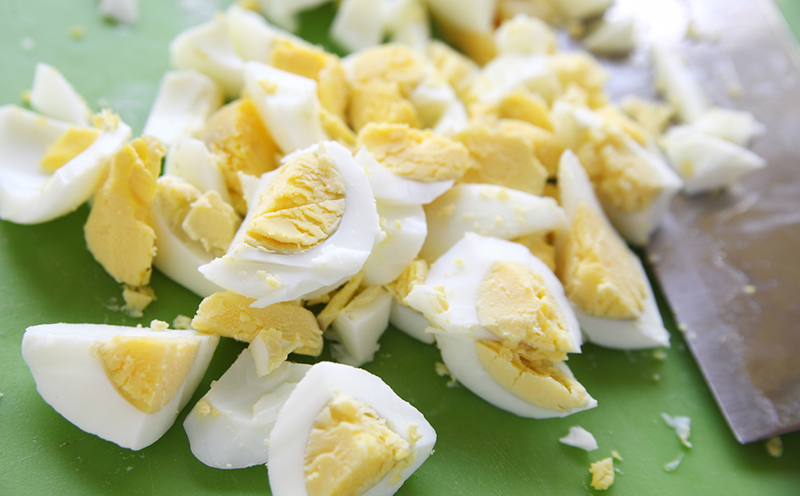 1. Ugotuj jajka na twardo, obierz i pokrój w dużą kostkę.