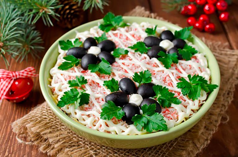 4. Wierzch sałatki na całej powierzchni, posyp oliwkami. Gotowe!