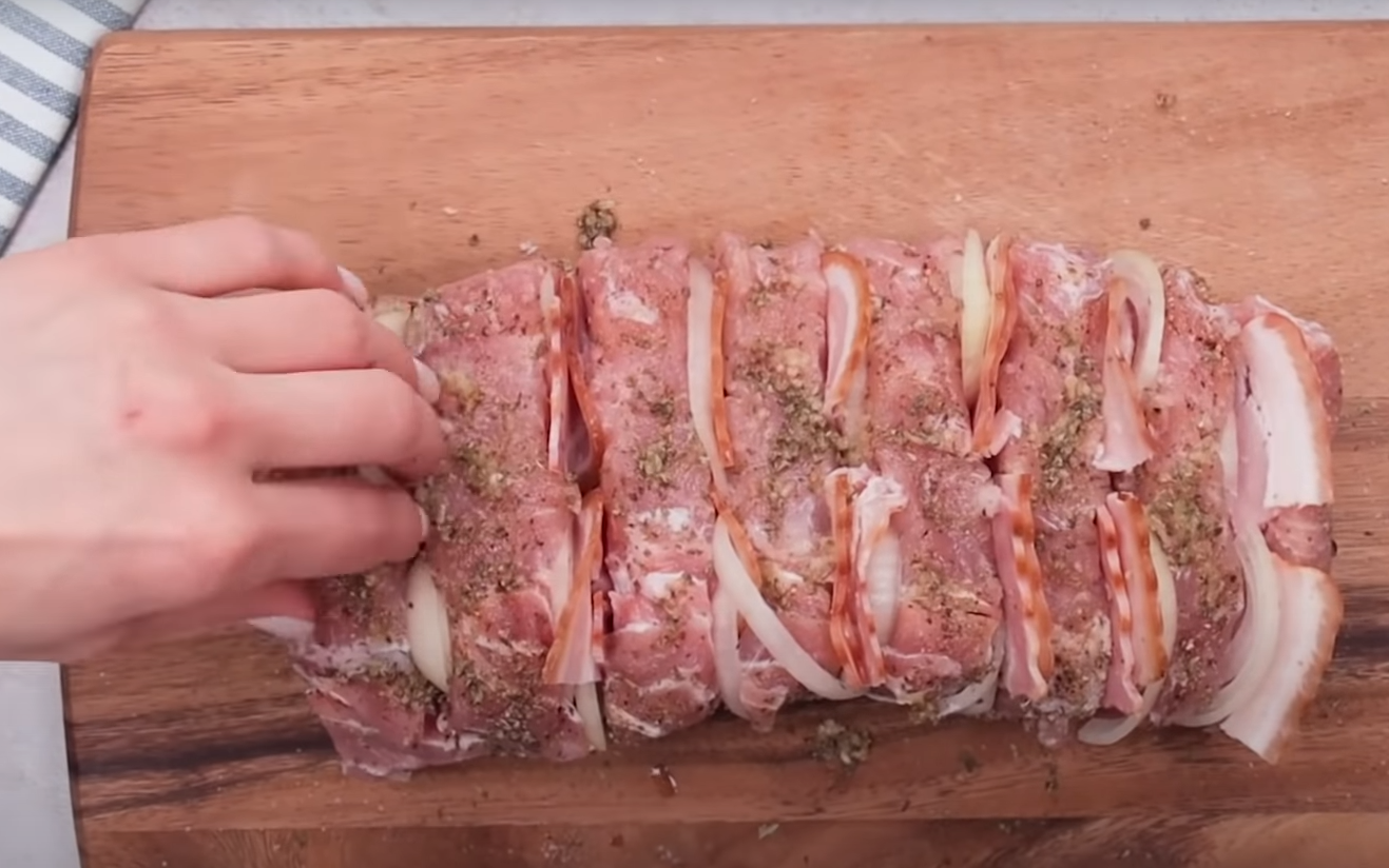 3. Obierz dokładnie cebulę, następnie pokrój ją na połówki. Wkładaj w mięso pokrojoną cebulę oraz boczek.