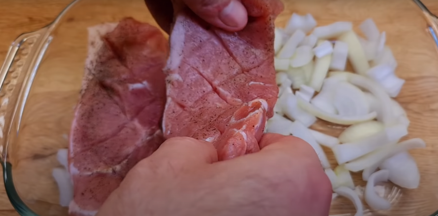 Mięso należy ponacinać tak, aby z nacięć utworzyć siatkę. Następnie mięso trzeba posolić i popieprzyć z obu stron.