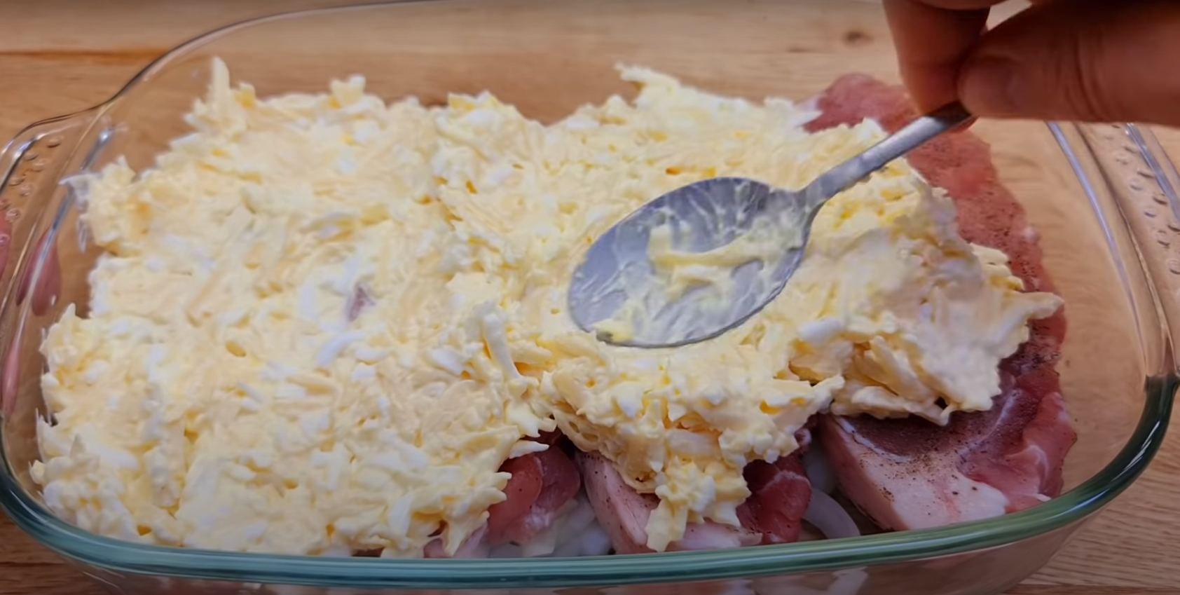 Na tarce trzemy ser oraz jajka. Do tego dodajemy sól oraz majonez. Tak przygotowaną masę kładziemy na mięso.