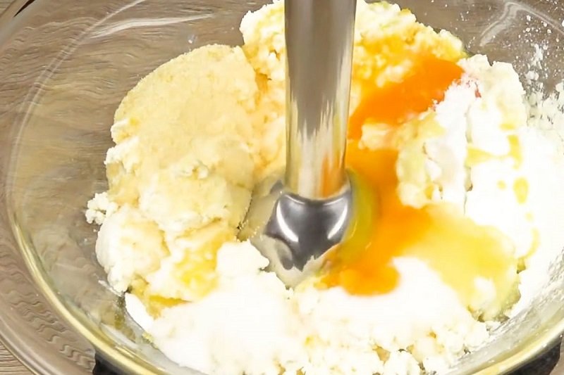 1.W dużej misce połącz ze sobą takie składniki jak: twaróg, sok oraz skórkę z cytryny, żółtka, proszek do pieczenia, skrobie kukurydzianą, cukier, wanilię, kaszę mannę jak i masło. Mieszaj za pomocą miksera do uzyskanie jednolitej konsystencji.