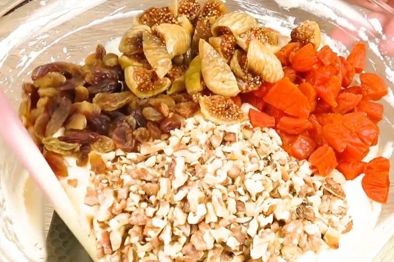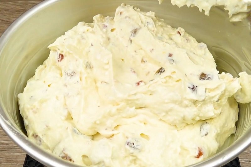 2.W osobnej misce ubij mikserem białka z dodatkiem szczypty soli, następnie dokładnie ubite powoli dodawaj do miski z twarogiem. Całość dokładnie wymieszaj po czym dodawaj bakalie. Pora na przygotowanie blachy do pieczenia. Do dokładnie wysmarowanej blachy , wlej otrzymaną masę twarogową. Wyrównaną masę posmaruj kwaśną śmietaną.