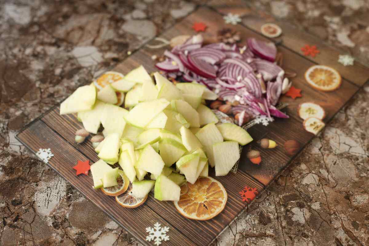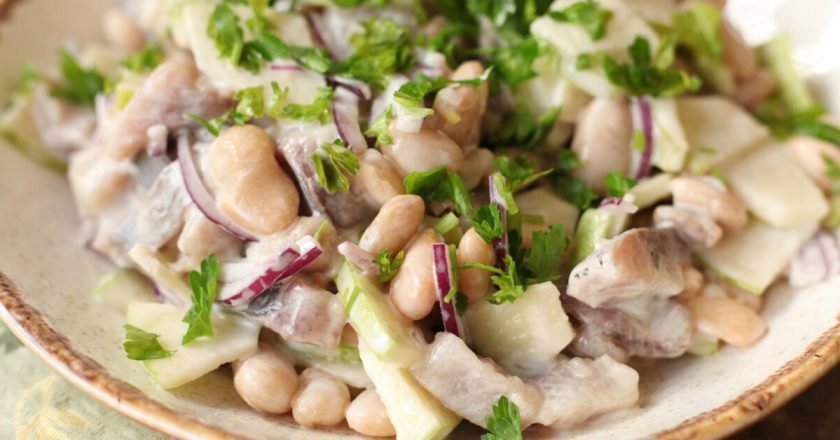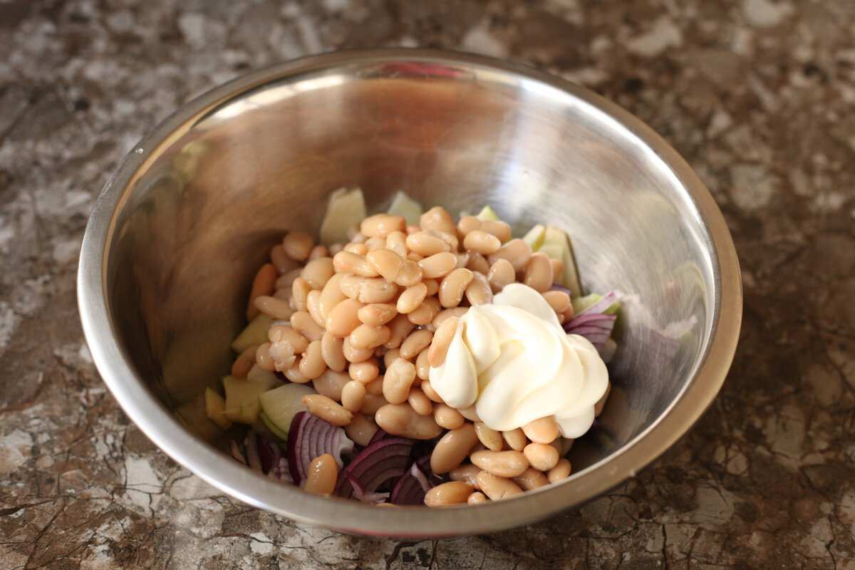 2. Jabłka dokładnie umyj, następnie usuń z nich gniazda nasienne, wraz ze skórką pokrój w kostkę, a cebulę obierz i w pół piórka pokrój. Składniki te przełóż do miski i dodaj fasolę odsączoną z zalewy oraz majonez, dokładnie wymieszaj.