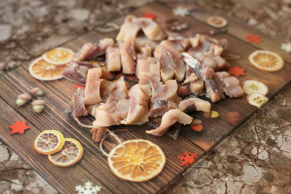 1. W średnią kostkę pokrój płat śledziowy bez ości.
