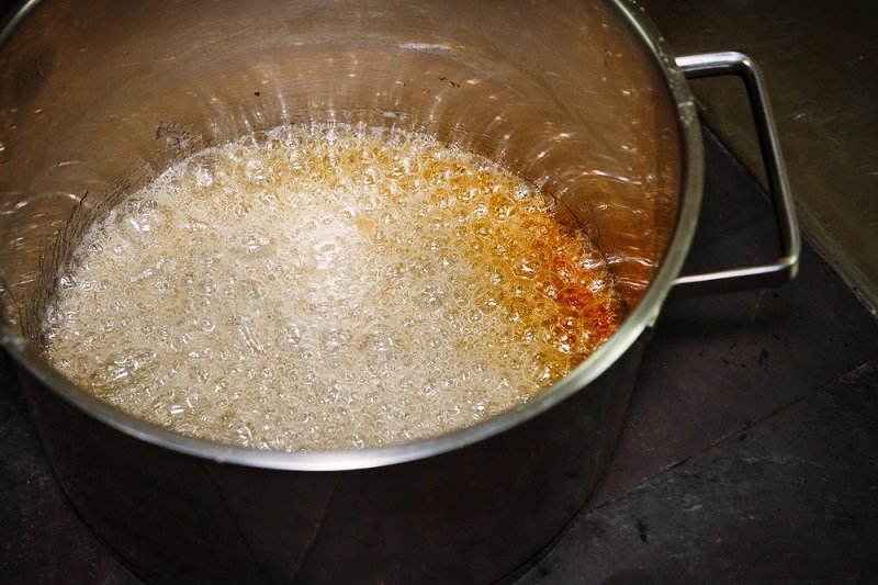 Doprowadzić syrop do wrzenia, a następnie dodać do niego śliwki. Zmniejszyć ogień do minimum i gotować przez około pół godziny. Syrop należy pozostawić na kuchence, często mieszając. Gdy syrop zgęstnieje, odstawić go do ostygnięcia.
