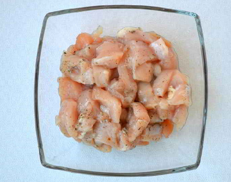 2. Potem, mięso pokrój na mniejsze kawałki, dopraw do smaku słodką papryką, czosnkiem granulowanym i solą. Dokładnie wymieszaj i odstaw na 15 minut.