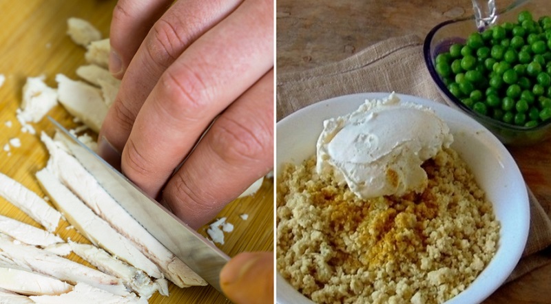 1. Ugotowanego wcześniej fileta z kurczaka (najlepiej w bulionie warzywnym), zmiel w maszynce do mięsa wraz z groszkiem. Potem dodaj przyprawy i ser. Dokładnie wymieszaj składniki, ponieważ będzie to podstawa naszej rolady.