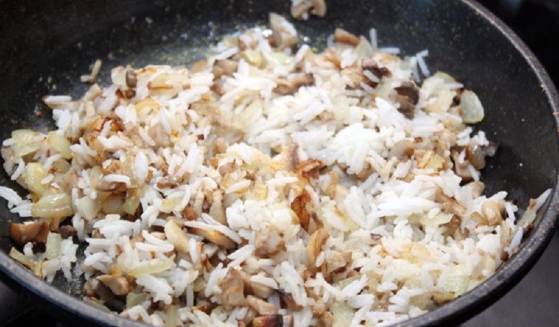 4. Podsmażone pieczarki z cebulą, wymieszaj z ugotowanym ryżem, dopraw do smaku solą i przyprawami, a następnie wszystko zmiel blenderem.