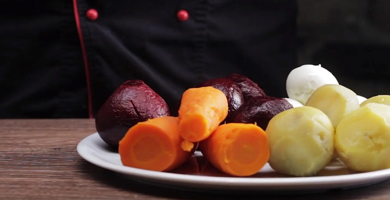 1. Buraki, ziemniaki i marchewkę, ugotuj wcześniej do miękkości. Jajka ugotuj na twardo.