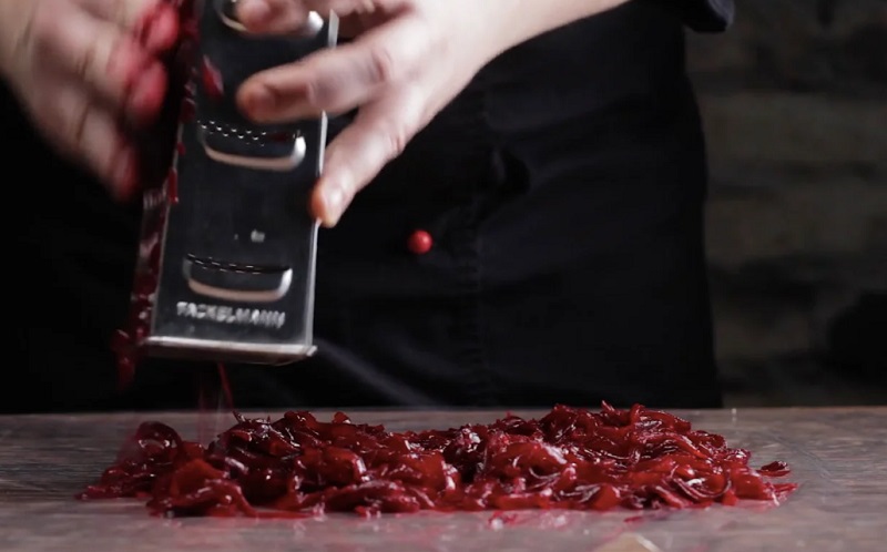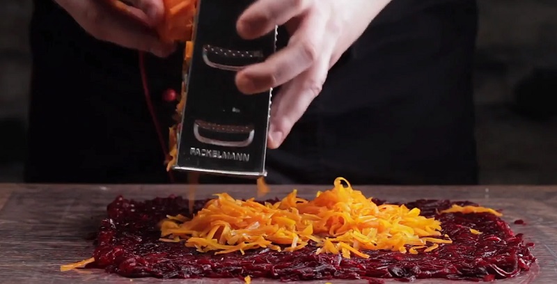 4. Zacznij od buraków: Na rozłożona folię, zetrzyj buraki na tarce o grubych oczkach i uformuj w kształcie prostokata. Lekko posól.