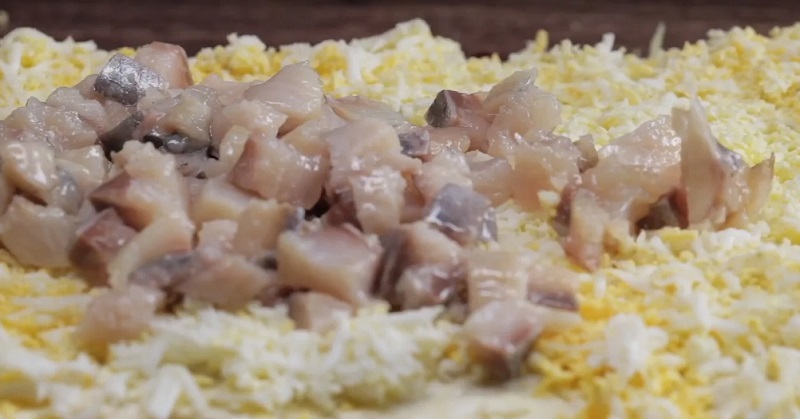8. Kolejna warstwa, to pokrojone na małe kawałki filety śledziowe.