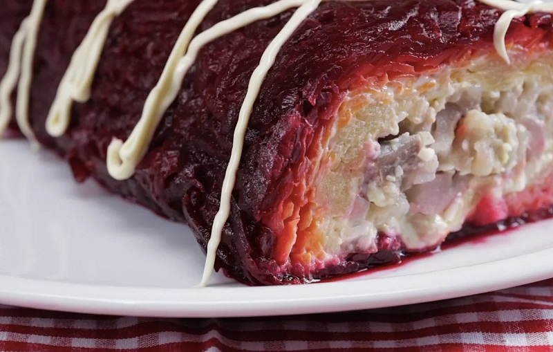 10. Teraz, bardzo delikatnie owiń folią wszystkie warstwy sałatki i lekko dociśnij. Wtedy nie będzie się rozpadać podczas nakładania. Wstaw do lodówki na 2-3 godziny. Gotowe!