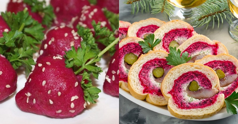4. Zacznij od buraków: Na rozłożona folię, zetrzyj buraki na tarce o grubych oczkach i uformuj w kształcie prostokata. Lekko posól.
