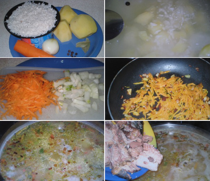 2. W garnku z lekko osoloną wodą, ugotuj ryż i ziemniaki. Na rozgrzanej patelni z masłem, podsmaż pokrojoną w drobną kosteczkę cebulę i starta na tarce marchew.
