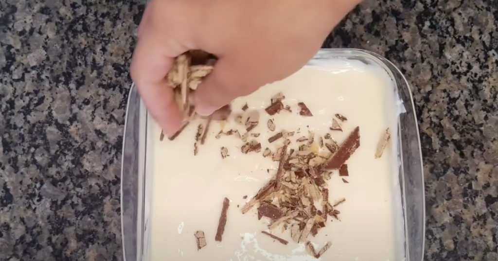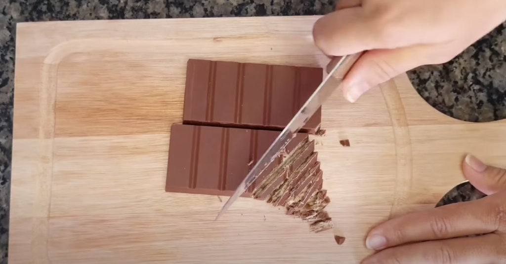 Tabliczkę czekolady posiekaj na drobne kawałki i wrzuć do deseru.