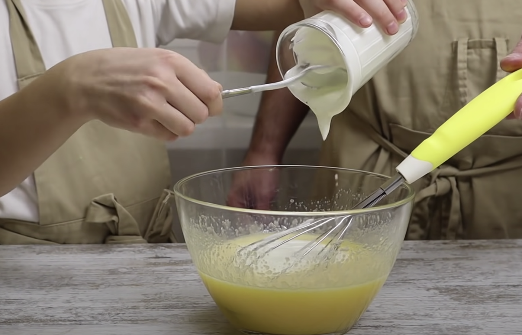 1. W wygodnej misce, ubij jajka z cukrem i cukrem waniliowym. Potem, dodaj jogurt i dobrze wymieszaj.