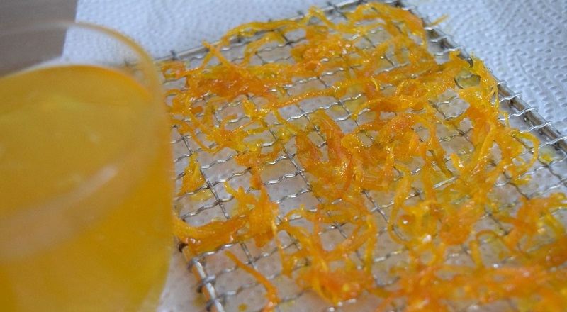 10. Odstaw garnek do wystygnięcia, oddzielając syrop od skórki. Skórkę kandyzuj w rozgrzanym piekarniku.